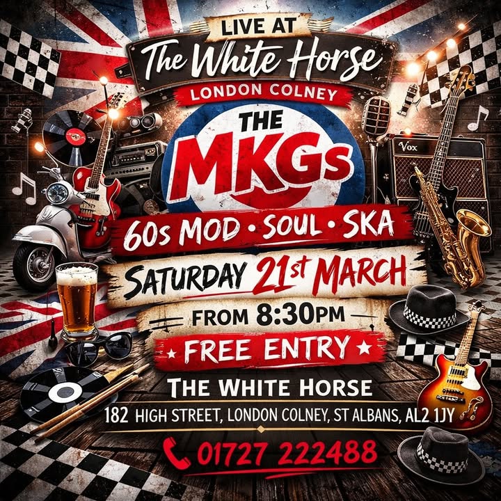 Join us for a brilliant night of live music as a local 4-piece band. The MKGs bring high-energy 60s mod, soul, and ska to The White Horse. Expect classic tracks from bands like The Who, The Kinks, Small Faces, and more – perfect for a fun Saturday night out with friends.
