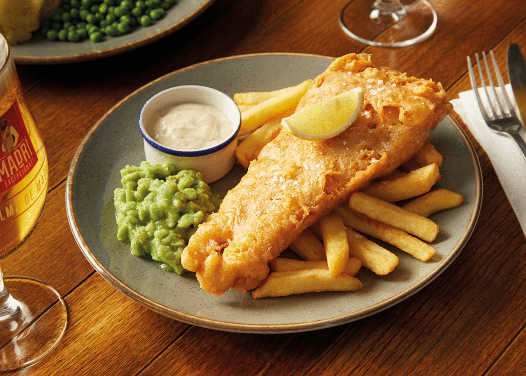 Beer-battered fish & chips, with your choice of garden or mushy peas (†) | 12.79 1095 kcals