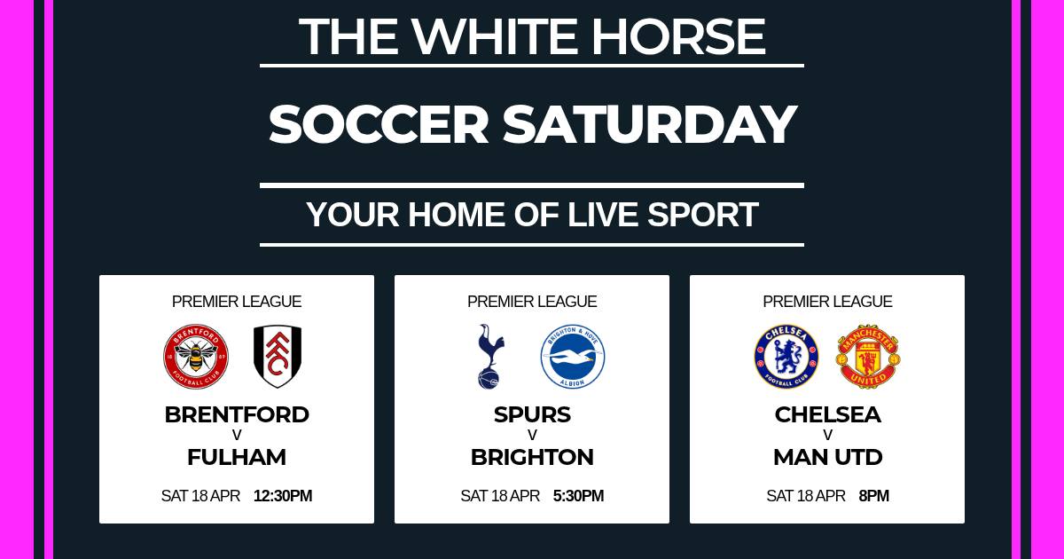 ⚽Soccer Saturday live at The White Horse⚽ We have football all day for your entertainment 🐝Brentford vs Fulham ⚪ Saturday's footballing action starts at the Gtech with a West London derby Brentford sit just one point off Chelsea and a win could put them in serious Champions League contention A win for Fulham could put them in a possible European place themselves ⚪Spurs vs Brighton🔵 Tottenham host Brighton in Roberto De Zerbi's first home match as Spurs boss De Zerbi's former side will be looking to land another blow to Tottenham's miserable form so far this year Spurs start the game week in the relegation zone and will be feeling the pressure Do Spurs go down? 🔵Chelsea vs Man United🔴 Chelsea host United in Saturday's late kick-off Both sides need points to ease nerves in the race for the top five Who wins at Stamford Bridge? 📺LIVE ON THE BIG SCREEN 🏠AT YOUR HOME OF SPORT