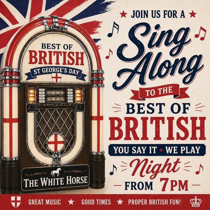 🎶 This Weekend at The White Horse 🎶 Friday – Full Volume Friday 🔊 Special guest DJ bringing the energy from 8pm till 1am Saturday – Best of British 🇬🇧 Celebrate St George’s Day with DJ Robski playing all the best British music 8pm till 1am Two big nights, one great weekend — don’t miss it!