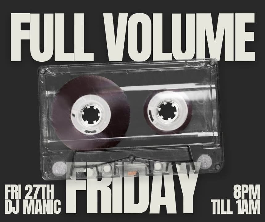 Tuen up the music this Friday with Full Volume DJ Manic will be playing the best music from all the eras Friday 27th 8pm - 1am
