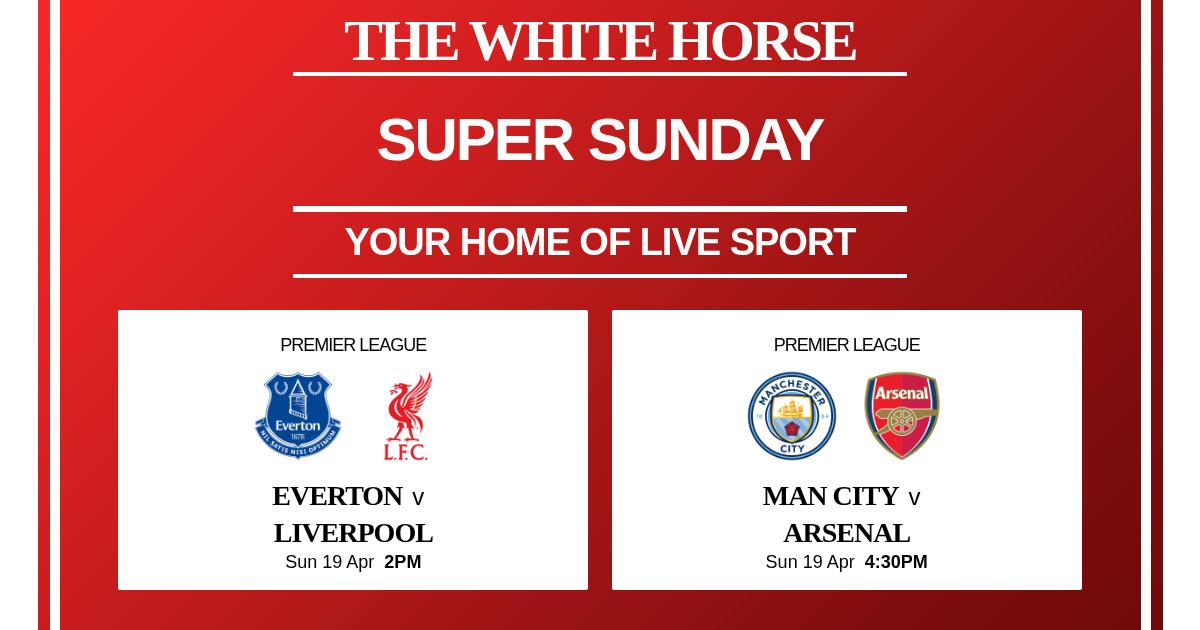 ⚽Super Sunday live at The White Horse⚽ 🔵Man City vs Arsenal🔴⚪ The biggest game of the season is here! It's first vs second, Arteta vs Pep, Red vs Blue Arsenal have been poor over recent weeks but will be boosted with confidence after securing another champions league semi-final on Wednesday City are the inform team but have had mixed form all season 🔵Everton vs Liverpool🔴 Super Sunday kick's off with the Merseyside derby as Everton host Liverpool for the first time in their new home A win for the Toffee's would put them just two points behind their city rivals Whereas Liverpool need three points to move clear of the chasing pack for fifth place Who wins the derby? 📺LIVE ON THE BIG SCREEN 🏠AT YOUR HOME OF SPORT